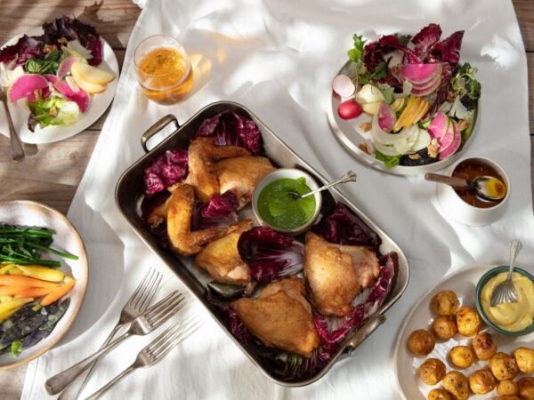 Disfrute en casa a la hora de cocinar estos contramuslos de pollo al horno, unas papas criollas con alioli y dos ensaladas de verduras exquisitas y diversas para compartir en la mesa.