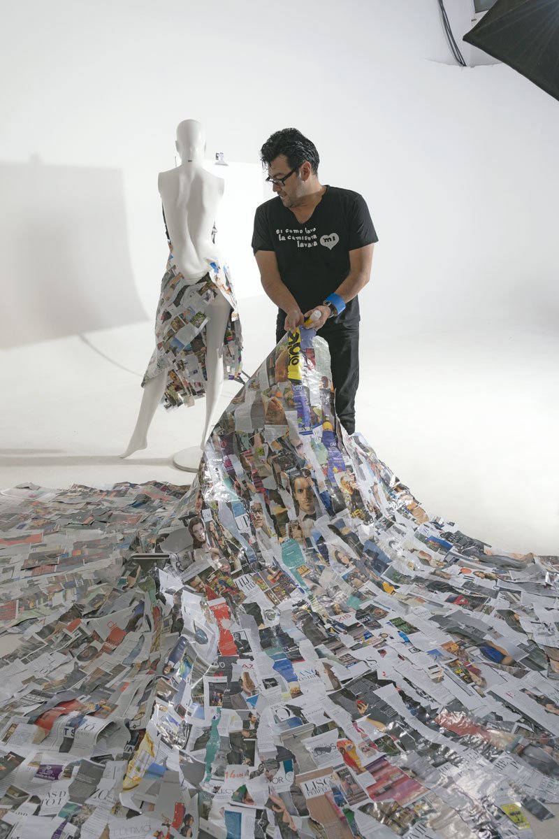 Después de darle muchas vueltas al tema, de hacer ensayos con impresiones en tela, con proyecciones y hasta con hojas de laurel, la noche antes de la sesión de fotos, junto a su hija y su esposa, comenzó a hacer un árbol-vestido con pedazos de páginas de revista rasgados, que terminó sobre la marcha.