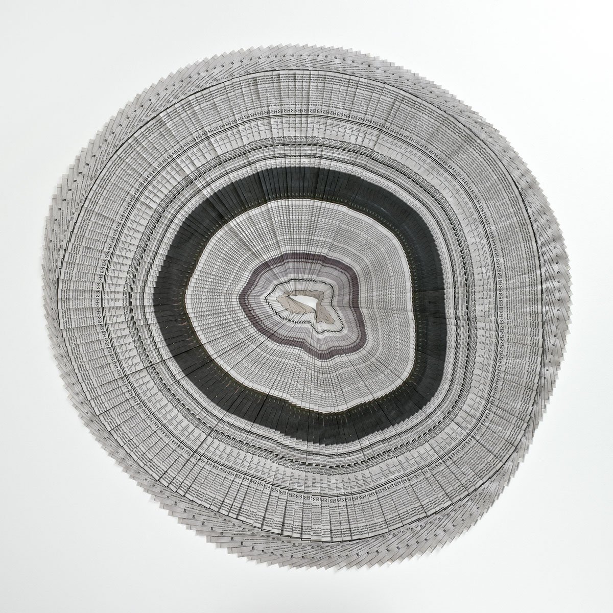 “Sin embargo, la fricción con el disco quemó el papel dándole un color ocre, y generó un olor a madera quemada. Eso me hizo pensar que la esencia del árbol como madera se mantenía vigente dentro del papel, y así llegué al árbol”.