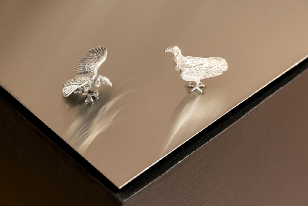 Y en este mismo paisaje se encuentran algunos animales, como los buitres, una especie a la que García pretende resignificar por medio de esculturas en plata pura. “Son animales que cumplen a cabalidad su función natural, pero la sociedad los maltrata, por eso los presento como joyas. Ellos son los que realmente denuncian las muertes en el río y alertan a los demás sobre la aparición de los cuerpos”, afirma.