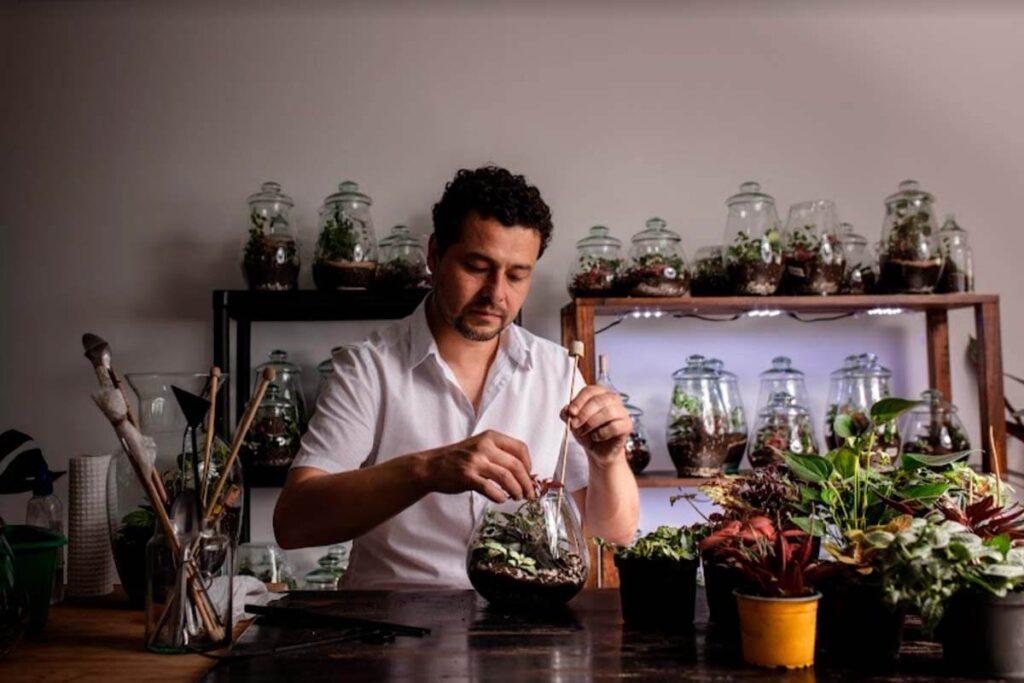 Sus manos de pianista no están destinadas solo a crear música, sino también pequeños universos naturales para refugiarse de todo lo que ocurre en el mundo. Diego Maldonado, creador de Botanik Lab, es músico de profesión, pero su pasión por las plantas se sumó a la pandemia y precipitó la consolidación de un oficio que desde entonces ocupa todo su tiempo: la creación de terrarios.