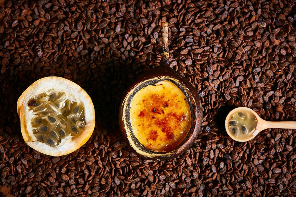 Así sucede, por ejemplo, con La Andina, una crema catalana con granadilla, pimienta de Timur, vino Château Climens Cyprès de Climens Barsac en Burdeos (Francia), y coñac Jean-Luc Pasquet de Claude. “Para esta preparación les presentamos a las personas la granadilla tal como es, y les cuento toda la cantidad de esta pasiflora que comía de niño. Posteriormente, la convertimos en una crema catalana y la volvemos a llevar a la mesa para que vean su transformación”.