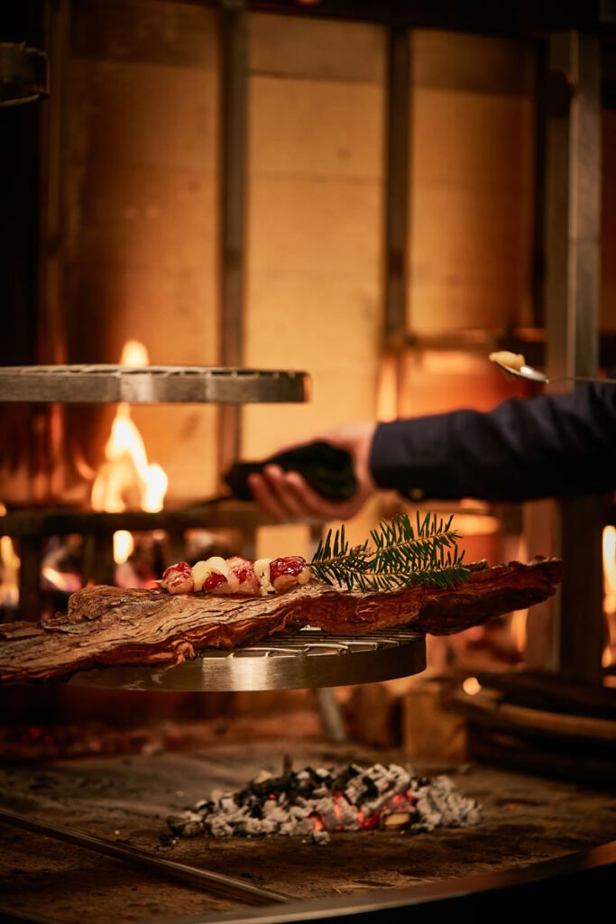 El segundo es “Smoke”, el humo generado por la evaporación de agua y dióxido de carbono que sucede inmediatamente después de encender la leña; aquí se encuentran las verduras a la parrilla. El tercero es “Flame”, la llama como tal; en este espacio hay cangrejo, langosta y vieiras al grill, en contacto directo con maderas de manzano, abedul, roble blanco y cerezo. El cuarto es “Embers”, la brasa, que incluye cortes de carne y pescado madurados que cambian diariamente. Y por último está “Cinders”, las cenizas, sección dedicada a los postres.