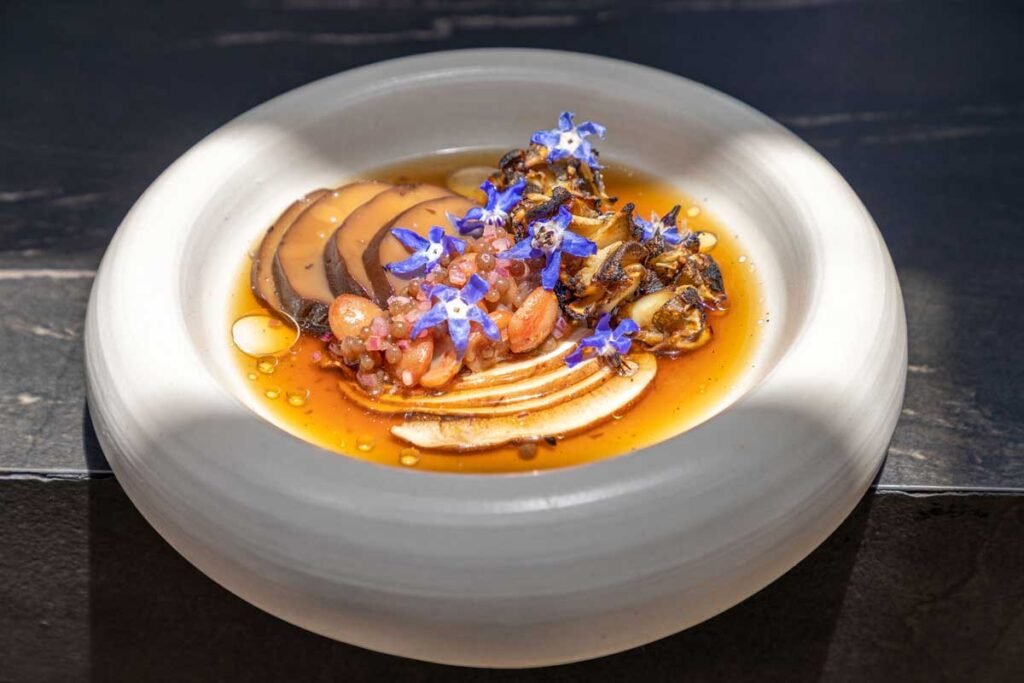 Caracol, pepa de tamarindo, portobelo y borraja, es un plato del chef Álvaro Clavijo en su restaurante El Chato. Cortesía El Chato.