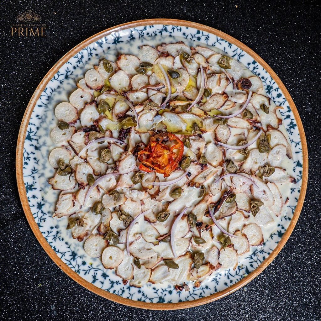 Mientras escucha un mariachi en vivo, disfrute de un menú degustación de cuatro pasos, que empieza con un carpaccio de pulpo mexicano con aceite de oliva, vinagreta de alcaparras y chiles secos. Luego, pruebe un rib eye en aguachile negro, ligeramente picante y acompañado de aguacate hass, pepino europeo y cebolla morada.