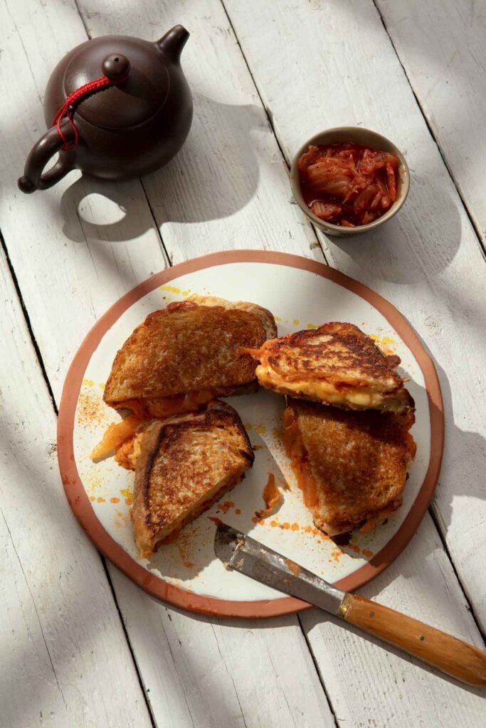 Mezcle los tres quesos en un recipiente; después, unte el lado exterior de las tajadas de pan con mantequilla. Luego, por el lado interno, unte la mayonesa, coloque la mezcla de queso y vierta el kimchi. Ponga las dos rebanadas juntas. Caliente una sartén a fuego medio con abundante mantequilla. Ponga las tostadas en la sartén caliente y encima coloque la tapa de una olla pesada para que queden bien prensadas. Cocine durante unos cuatro a seis minutos, luego dele la vuelta y cocine por cinco minutos más. Corte por la mitad para servir.
