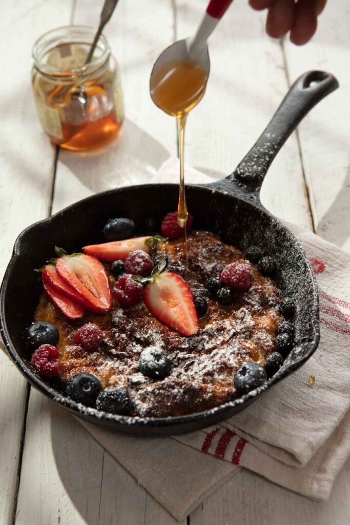 Para los más golosos está este panqueque conocido como Dutch baby, que se prepara en el horno, luego se le agrega abundante miel y se sirve con un puñado de frutos rojos; de seguro le encantará.