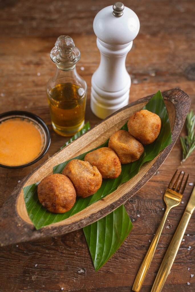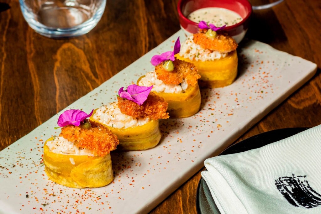 La recomendación es pedir varios platos para compartir al centro de la mesa y disfrutar de entradas poderosas como las carimañolas de maduro, el cayeye relleno de posta cartagenera o el enyucado  dorado con mantequilla con queso costeño y jaiba acevichada; si quiere  algo más ligero, puede pedir el ceviche mixto de lulo, que viene con la pesca del día, camarón apanado, cubos de lulo y pepino tatemados, leche de tigre de lulo, crocantes de mango y ají criollo.