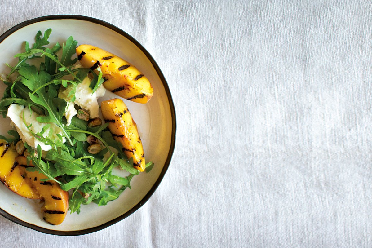 Ensalada de duraznos a la parrilla, mozzarella y rúgula