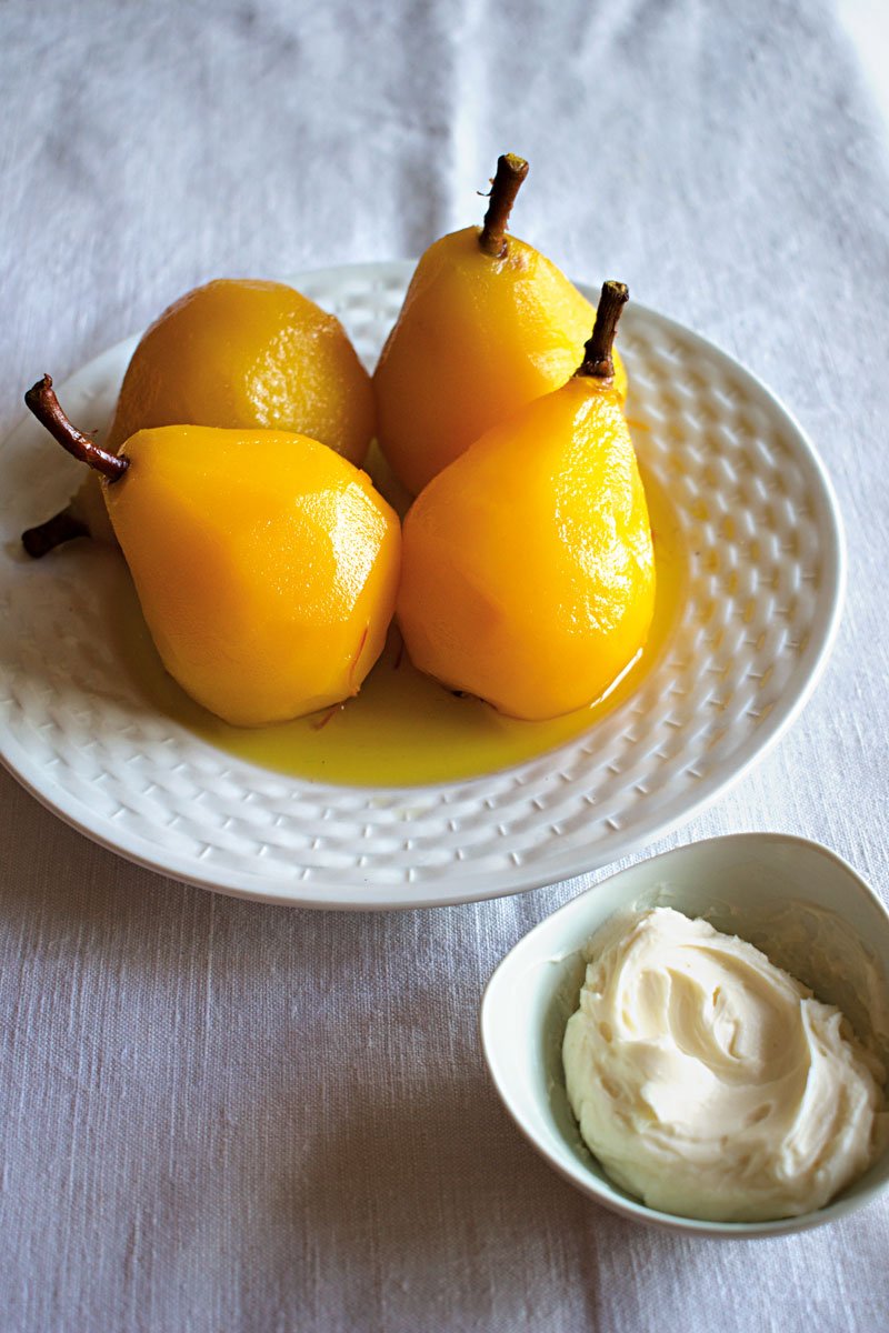 Peras escalfadas con vino blanco y azafrán