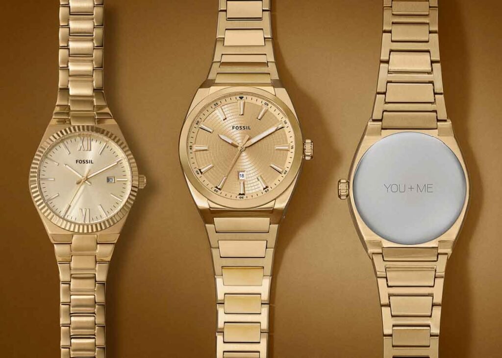 Un par de relojes Fossil hechos en acero color dorado, tanto en su caja, pulsera y tablero, y ambos vienen con calendario. Además, se pueden personalizar con mensajes románticos como “You + me”.