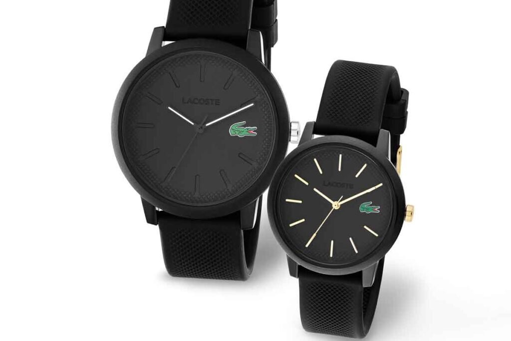 La pareja de relojes Lacoste color negro, con diferentes diámetros, pulseras de silicona con el característico tejido petit pique de esta marca y un detalle distintivo: la corona del reloj femenino, junto con el broche, son dorados, mientras que en el modelo masculino es color platino.