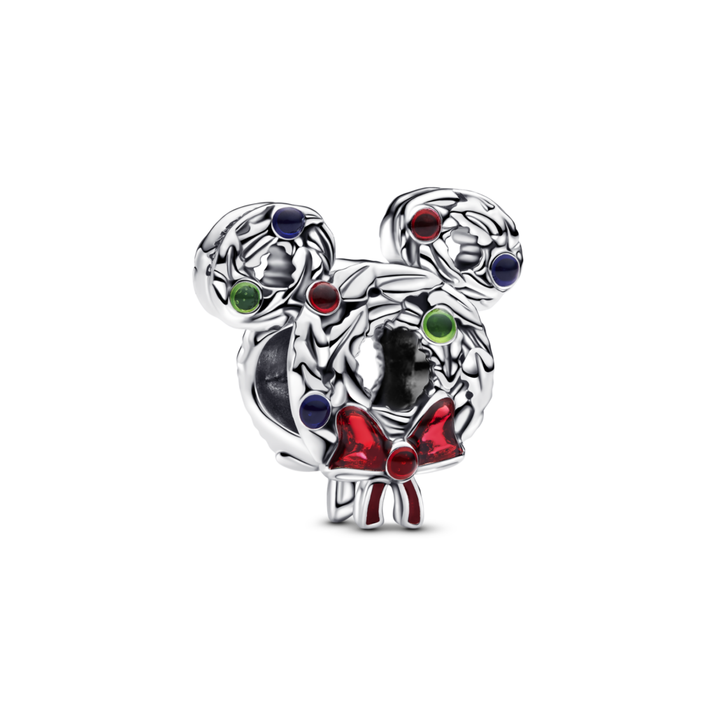 La colección no estaría completa sin los toques navideños que caracterizan esta colaboración. Uno de los charms más entrañables presenta a Mickey Mouse en un diseño festivo que incluye colores típicos de la temporada y una guirnalda adornada con un delicado moño. Minnie Mouse también brilla con su inconfundible moño rojo, integrado en un diseño elegante que combina plata y circonitas cúbicas transparentes.
