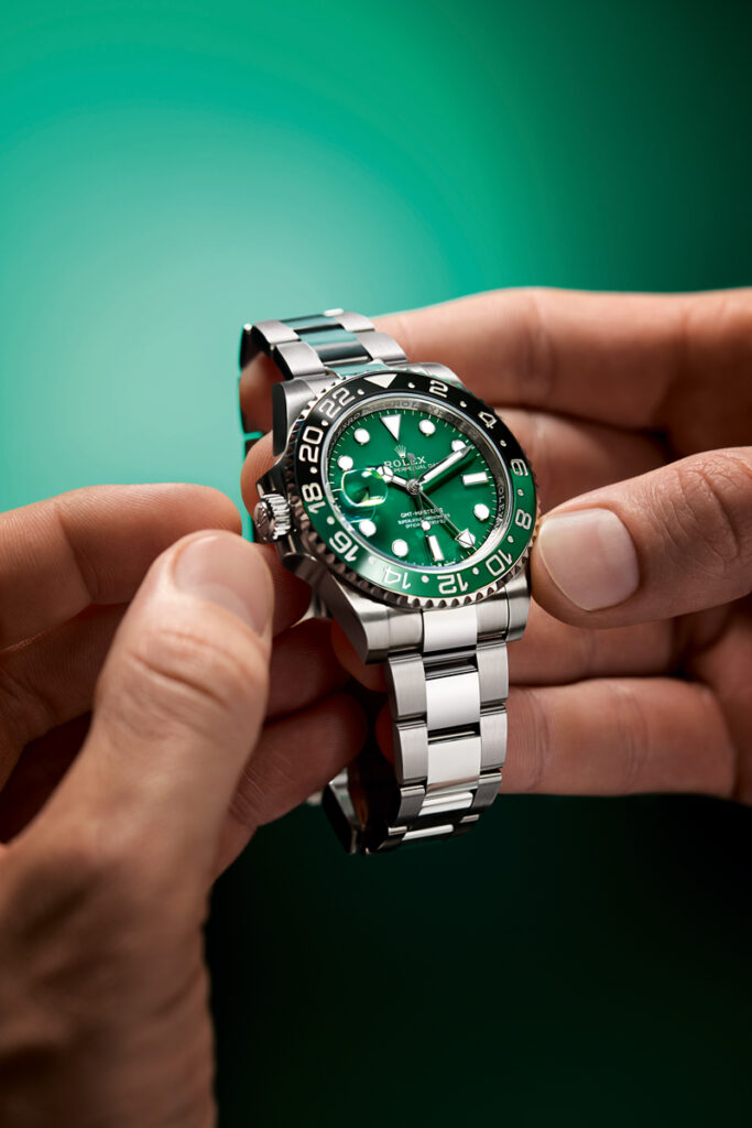 Rolex sorprende con su primera esfera de cerámica en el GMT-Master II. Denominada Cerachrom, esta nueva pieza es pionera en la tecnología de elementos altamente resistentes. La esfera armoniza, además, con el disco del bisel verde y negro. Adicionalmente, el doble uso horario en la manecilla secundaria del reloj busca acercar a las personas, rompiendo las barreras entre horarios por medio del estilo y la durabilidad.