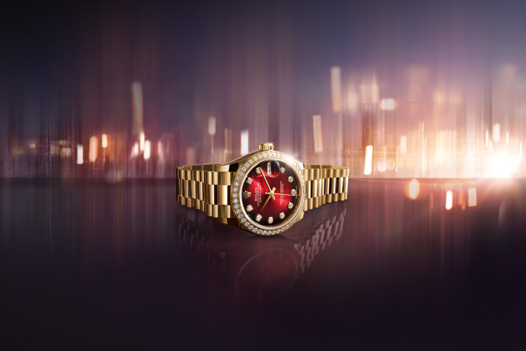 El Datejust 31 transita entre las luces y sombras con una esfera roja carmesí, en la que se emplea por primera vez en la historia de esta casa relojera la tecnología PVD (depósito físico en fase vapor), proceso que es particularmente complejo si su objetivo es lograr este tono en particular. Desde el fuego luminoso del centro, hasta el sombreado del contorno, ambos se realzan con un engaste de diamantes en el bisel y un recubrimiento de oro de 18 kilates.