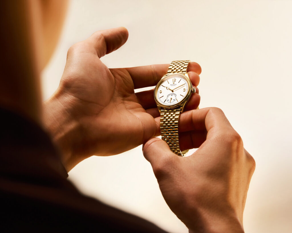 El Perpetual 1908, en oro amarillo de 18 kilates, es un reloj flexible y ligero. Cuenta con un brazalete exclusivo para este modelo, conformado por elementos muy pequeños y ligeramente abombados, además de un cierre invisible, que evoca a los brazaletes antiguos. Un homenaje a la tradición relojera.