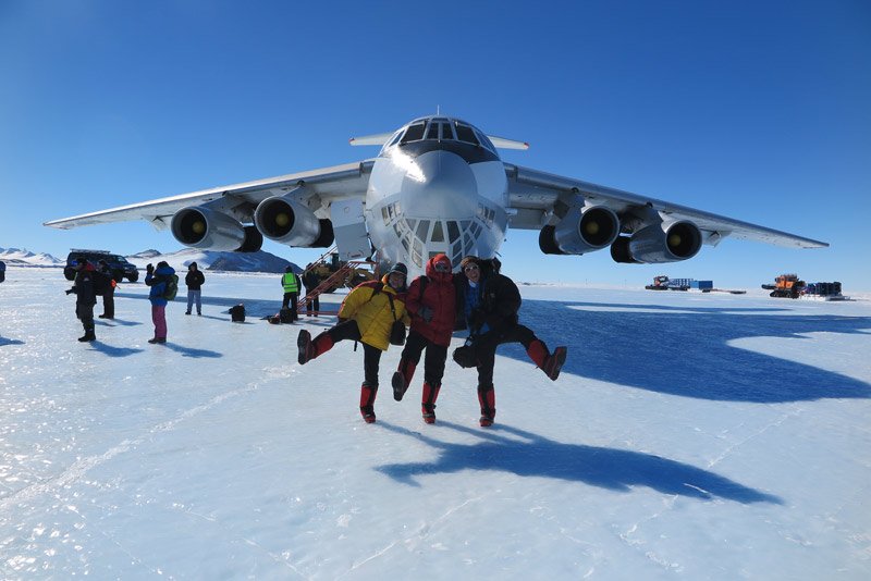 Llegada a la Base de Operaciones en el Union Glacier, a bordo del carguero ruso Ilushin-76 que aterriza sobre una pista de hielo