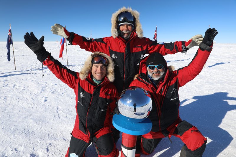 Celebrando con Juan Pablo Montejo y Abbas Jafarian en el hito del Polo Sur Ceremonial. Montejo y Jafarian son los primeros en sus países (Colombia e Irán) en alcanzar el Polo Sur en esquís