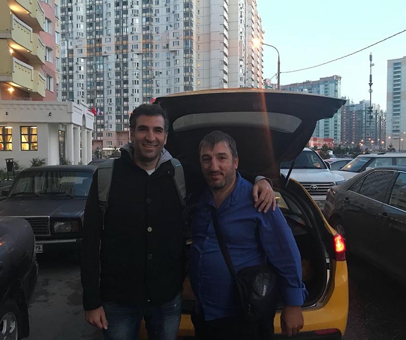 Adolfo Zableh junto a Simón, el taxista más amable de Moscú.