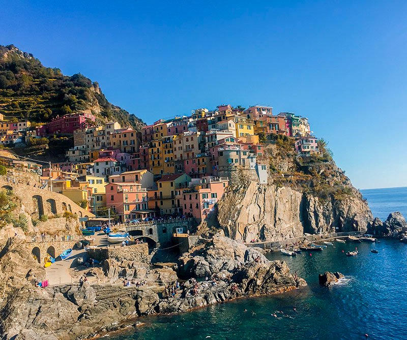 Es una enorme roca, salpicada de pequeñas casas en cascada, adornada por una vaga vegetación y rodeada por el mar. El camino desde la estación del tren está repleto de tienditas, bares y restaurantes donde se puede comer un elaborado plato italiano, tomar el típico y refrescante Aperol Spritz o elegir un snack de pescado con mariscos fritos.
