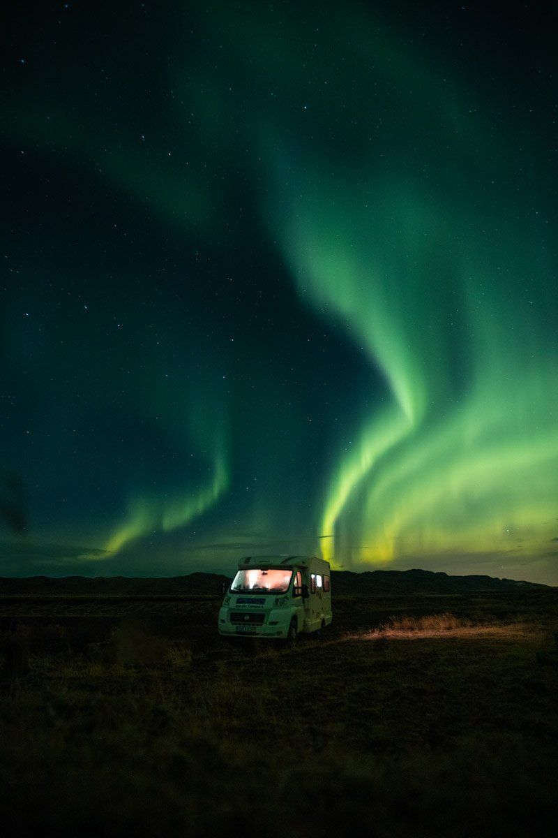 De regreso a la capital islandesa nos topamos con la cereza del pastel de un viaje memorable. Joaquín Linares, nuestro otro guía español, nos llamó para decirnos que había mucha actividad en el cielo –ellos monitorean constantemente la presencia de las auroras boreales–; nos recogió para salir de la ciudad, pero era tal la intensidad de estas bailarinas del norte, que nos detuvimos en medio de un barrio para apreciarlas; el cielo era verde y se movía como nunca habíamos visto antes.