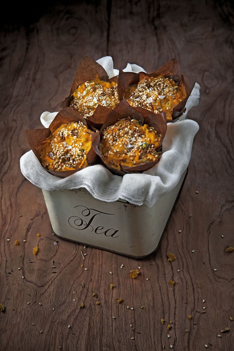Dentro de los moldes de muffin, coloque el aceite con las especias encima y luego espolvoree el ajonjolí encima. Lleve al horno por 10 minutos. Baje la temperatura a 165 oC/ 325 oF y cocine por 30 minutos o hasta que esté cocido por dentro. Retire del horno. y déjelo enfriar.