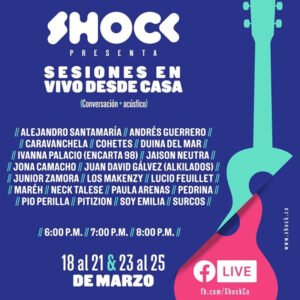 Con el #GuíaShockParaNoSalirDeCasa, la revista Shock anunció hoy que 20 artistas como Paula Arenas, Soy Emilia, Duina del Mar y Alejandro Santamaría harán parte las Sesiones en Vivo desde Casa, una propuesta que pretende ser “un espacio para la conversación y un toque acústico con cantautores colombianos a través de nuestro Facebook Live”, según anunciaron en sus redes.
