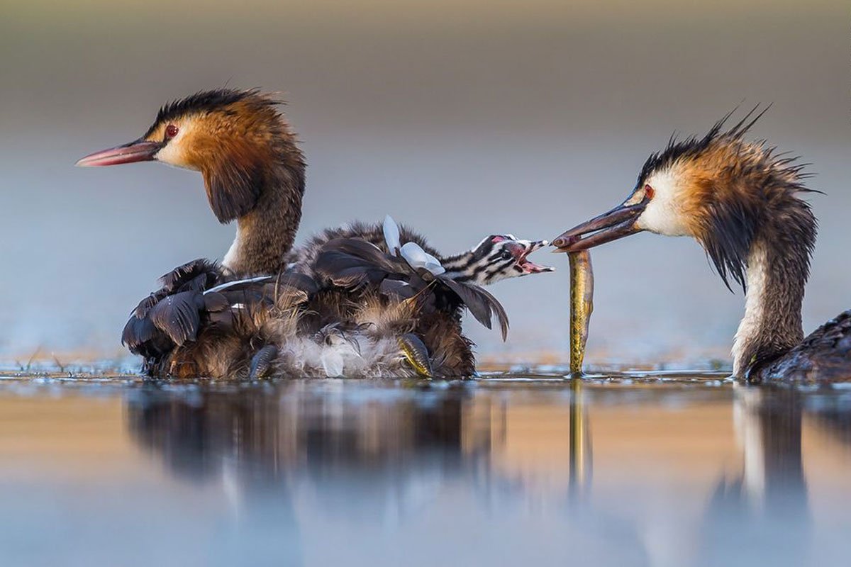 José Luis Ruiz Jiménez capturó esta foto de una familia de somormujos en una laguna en el oeste de España. Para eso tuvo que esconderse debajo de una carpa camuflada y usar una cámara flotante. La fotografía ganó la categoría de Comportamiento de las aves por su retrato de un padre alimentando a su polluelo.