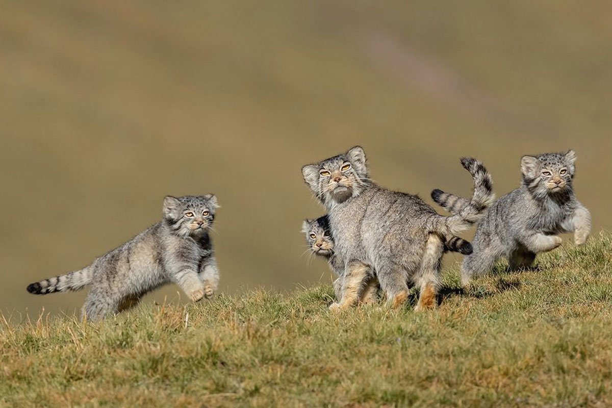 El fotógrafo Shanyuan Li tardó seis años en capturar esta rara imagen de una familia de gatos de Pallas en las estepas de la meseta del Tíbet de Qinghai, al noroeste de China. Estos pequeños felinos son solitarios, difíciles de encontrar y en su mayoría activos al amanecer y al anochecer.