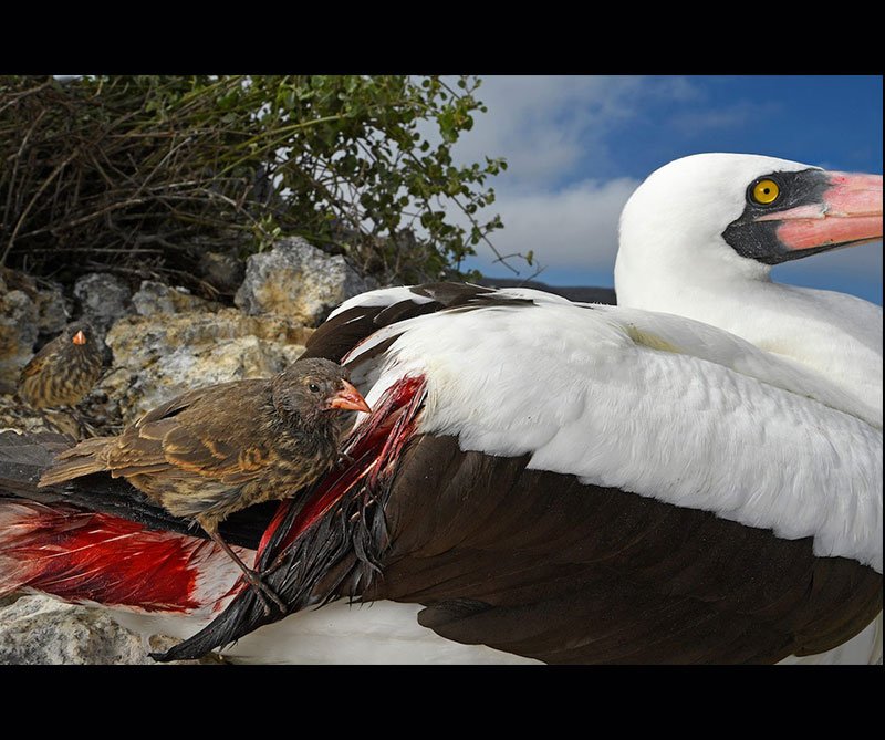 – El fotógrafo Alemán Thomas P. Peschak llegó a la isla Wolf, una parte remota de Galápagos donde la poca lluvia hacer de este un lugar inhóspito para sobrevivir. De ahí que Peschak encontró a un pájaro Pinzón picoteando a un Piquero de Nazca hasta beber su sangre.
